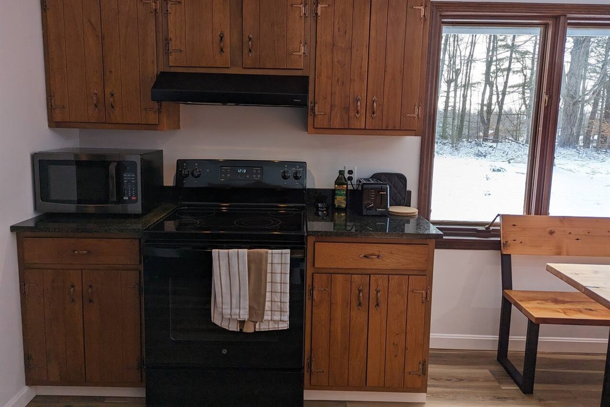 * **Rustic kitchen** with granite countertops, modern appliances, Keurig + Nespresso machines for your perfect morning coffee.