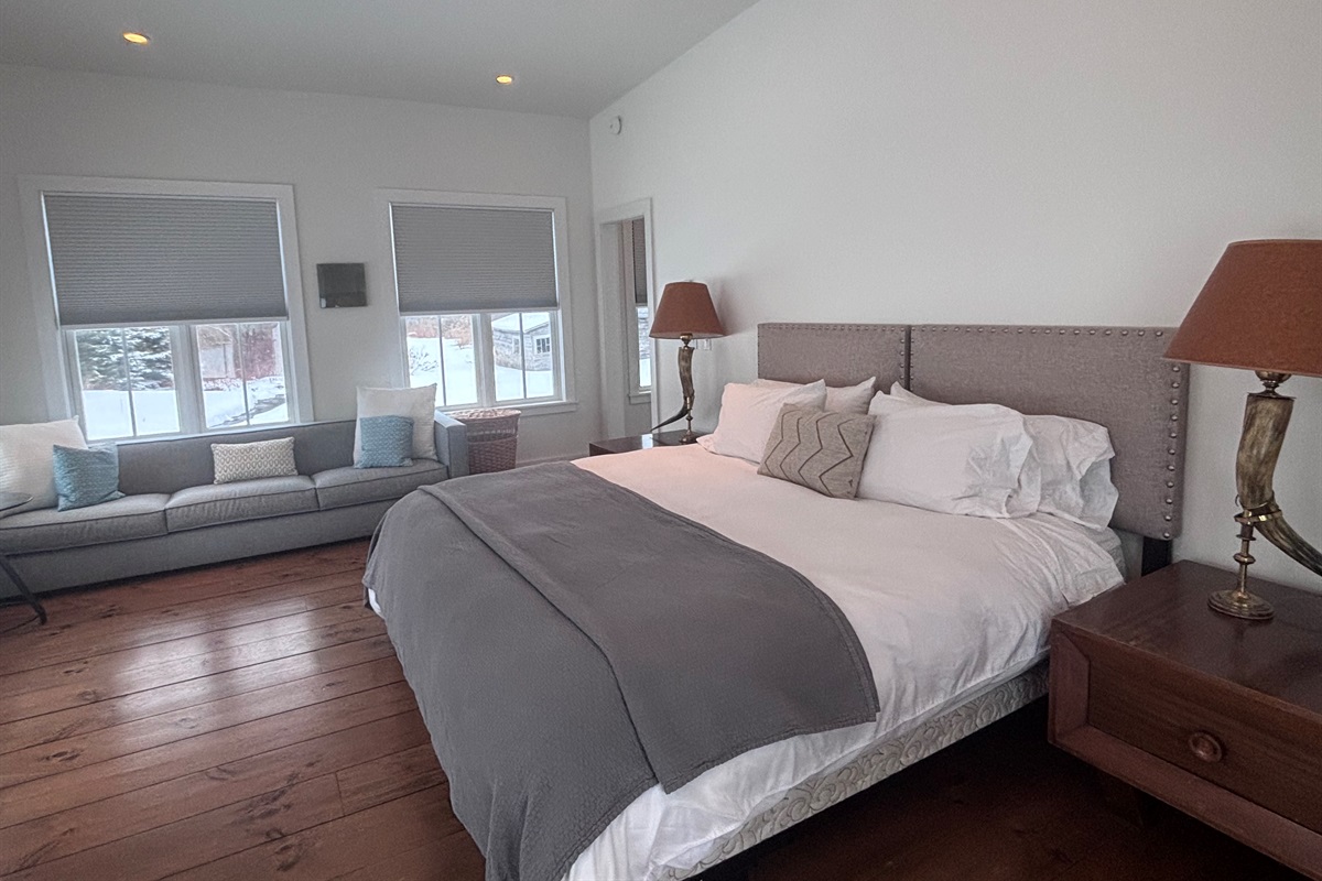 Comfortable queen bedroom with vaulted ceiling, warm hardwood floors, and bedside lighting.