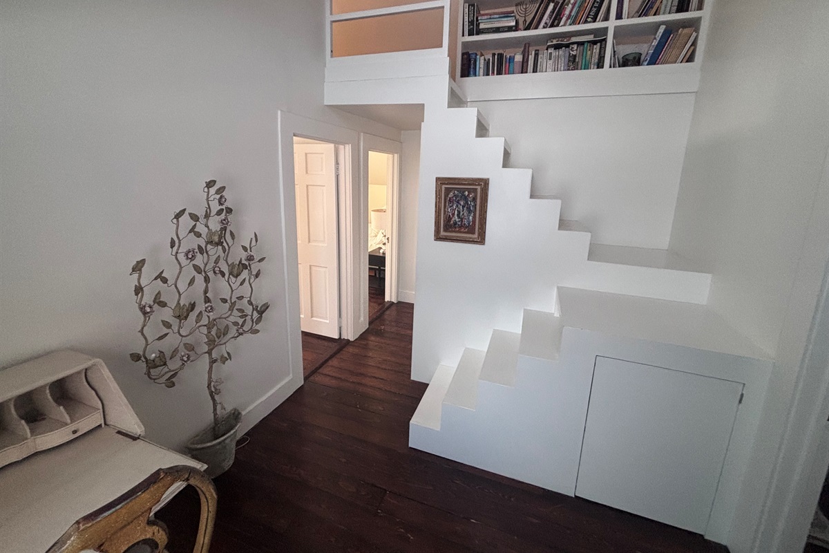 Architectural staircase with built-in shelving—bright, airy, and full of charm.
